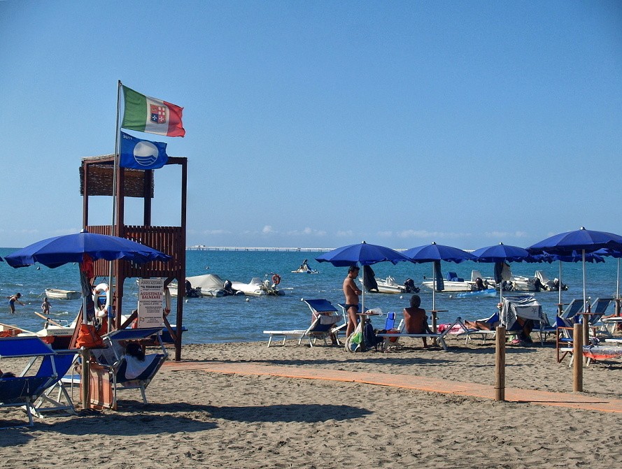 Některé pláže jsou soukromé, ale to neznamená, že tam je vstup zakázaný. Podél moře lze volně procházet, což se všeobecně respektuje a tak jsou první lehátka pod stejnobarevnými slunečníky vždycky pár metrů od vody. Ve stánku, často spojeném s občerstvením, si lze zakoupit místo na lehátku se stínítkem hlavy nebo bez něho, volně nebo pod slunečníkem – na italské poměry za celkem rozumnou cenu. Často bývá u takové pláže i restaurant, možnost vypůjčit si šlapadlo se skluzavkou, případně lodičku, zahrát si plážový volejbal… Povinností provozovatele takové pláže – a jsou hojně využívané – je ráno uvláčet jejich písek a přes den se starat o pořádek. Samozřejmostí je plavčík.