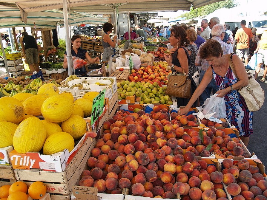 švestky, ryngle, meruňky, broskve, banány, kiwi, medové melouny, papriky zelené, červené a proužkované, salát ledový i kadeřavý, patisony, okurky, květáky, fazolové lusky, samozřejmě cibule a česnek, rajčata čili pomodori několika druhů, celer a další zelenina, kterou potřebuje každá kuchyňka… co hrdlo ráčí za solidní ceny! Speciální nabídka - to jsou sušená rajčata, olivy různých druhů v různém nálevu, různé druhy ořechů… Člověk by předpokládal, že na italském trhu bude plno rámusu a trhovci se budou předhánět ve svých nabídkách, ale nic takového, převládá běžný ruch.